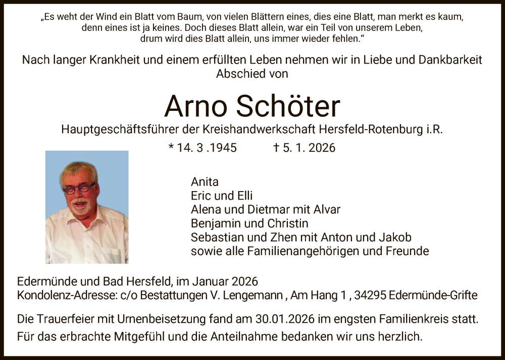 Hier finden Sie alle Traueranzeigen aus der Zeitung, die bisher für Arno Schöter erschienen sind. Weitere Traueranzeigen, die in der Zeitung erscheinen, werden hier ebenfalls aufgelistet