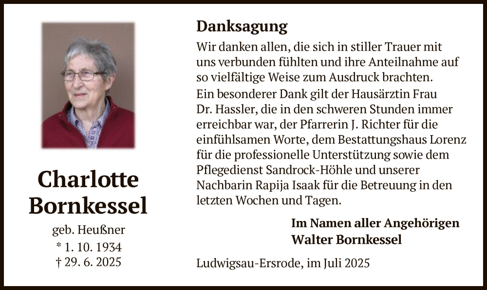Hier finden Sie alle Traueranzeigen aus der Zeitung, die bisher für Charlotte Bornkessel erschienen sind. Weitere Traueranzeigen, die in der Zeitung erscheinen, werden hier ebenfalls aufgelistet