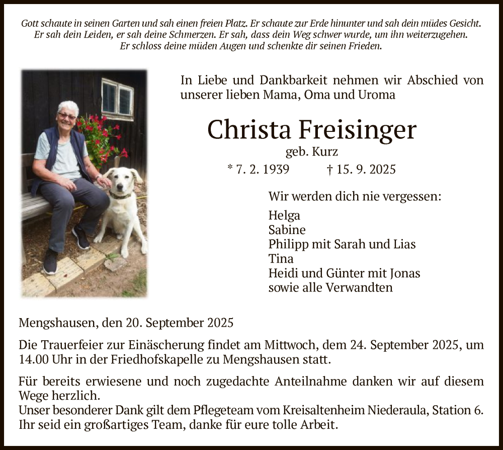Hier finden Sie alle Traueranzeigen aus der Zeitung, die bisher für Christa Freisinger erschienen sind. Weitere Traueranzeigen, die in der Zeitung erscheinen, werden hier ebenfalls aufgelistet