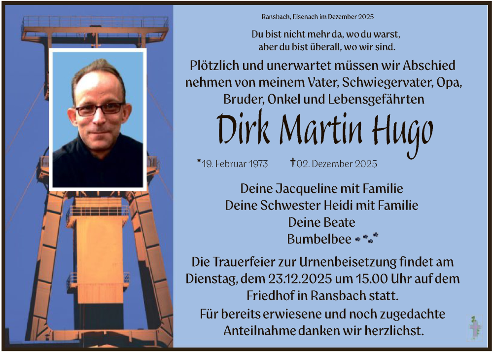 Hier finden Sie alle Traueranzeigen aus der Zeitung, die bisher für Dirk Martin Hugo erschienen sind. Weitere Traueranzeigen, die in der Zeitung erscheinen, werden hier ebenfalls aufgelistet