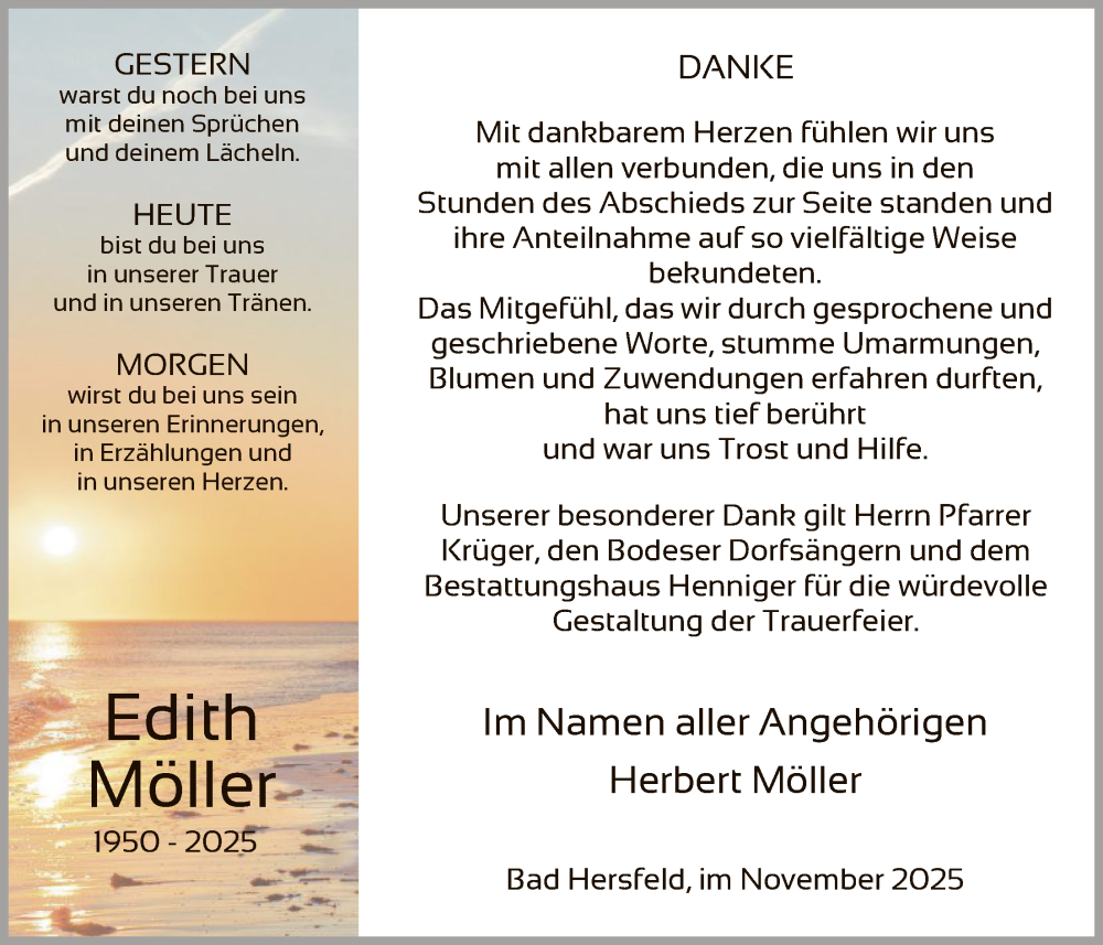 Hier finden Sie alle Traueranzeigen aus der Zeitung, die bisher für Edith Möller erschienen sind. Weitere Traueranzeigen, die in der Zeitung erscheinen, werden hier ebenfalls aufgelistet