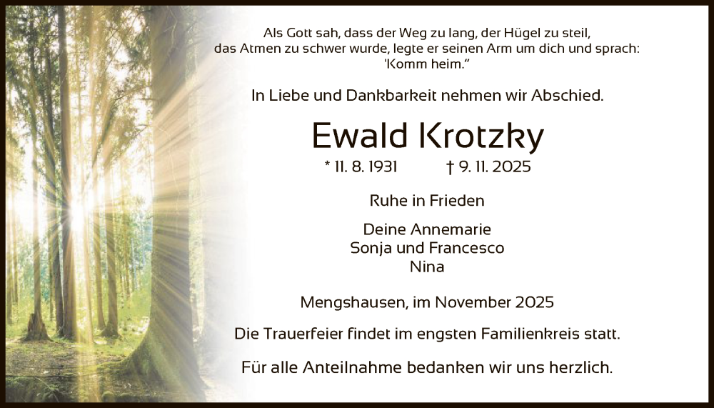 Hier finden Sie alle Traueranzeigen aus der Zeitung, die bisher für Ewald Krotzky erschienen sind. Weitere Traueranzeigen, die in der Zeitung erscheinen, werden hier ebenfalls aufgelistet