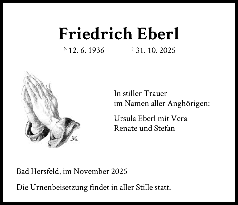 Hier finden Sie alle Traueranzeigen aus der Zeitung, die bisher für Friedrich Eberl erschienen sind. Weitere Traueranzeigen, die in der Zeitung erscheinen, werden hier ebenfalls aufgelistet