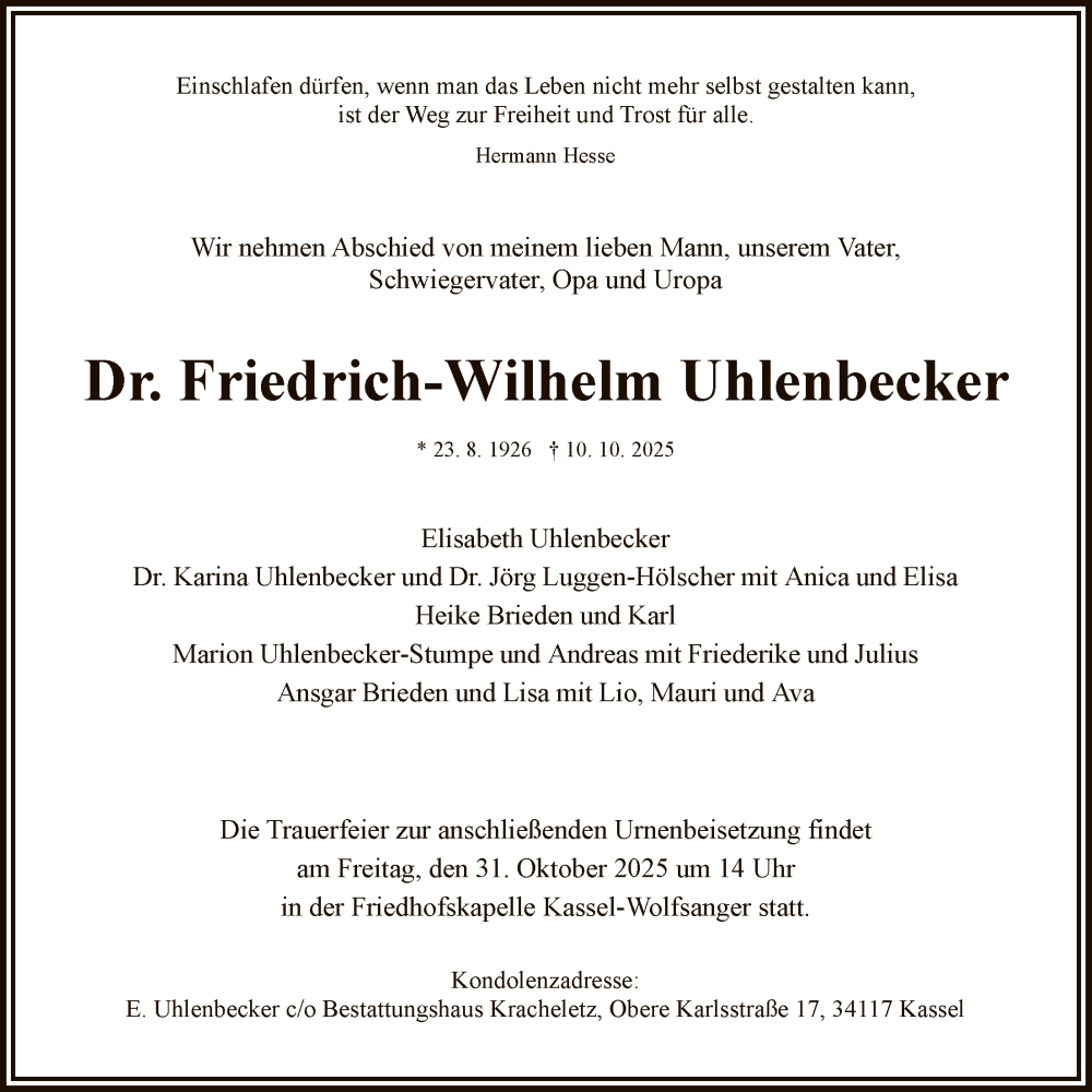 Hier finden Sie alle Traueranzeigen aus der Zeitung, die bisher für Friedrich-Wilhelm Uhlenbecker erschienen sind. Weitere Traueranzeigen, die in der Zeitung erscheinen, werden hier ebenfalls aufgelistet