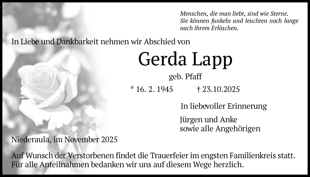 Hier finden Sie alle Traueranzeigen aus der Zeitung, die bisher für Gerda Lapp erschienen sind. Weitere Traueranzeigen, die in der Zeitung erscheinen, werden hier ebenfalls aufgelistet