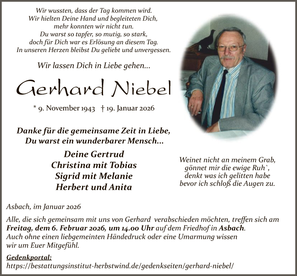 Hier finden Sie alle Traueranzeigen aus der Zeitung, die bisher für Gerhard Niebel erschienen sind. Weitere Traueranzeigen, die in der Zeitung erscheinen, werden hier ebenfalls aufgelistet