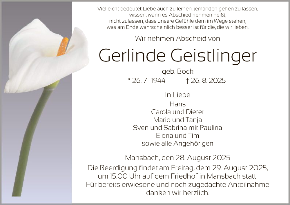 Hier finden Sie alle Traueranzeigen aus der Zeitung, die bisher für Gerlinde Geistlinger erschienen sind. Weitere Traueranzeigen, die in der Zeitung erscheinen, werden hier ebenfalls aufgelistet