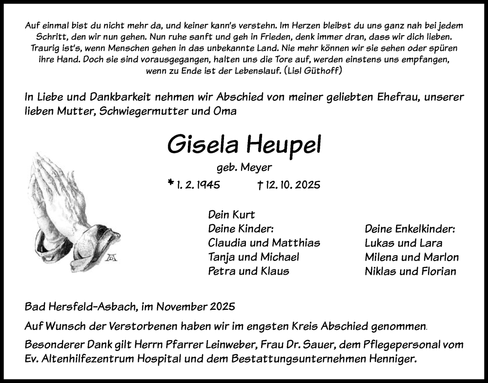 Hier finden Sie alle Traueranzeigen aus der Zeitung, die bisher für Gisela Heupel erschienen sind. Weitere Traueranzeigen, die in der Zeitung erscheinen, werden hier ebenfalls aufgelistet