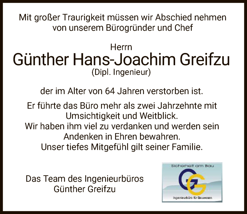 Hier finden Sie alle Traueranzeigen aus der Zeitung, die bisher für Günther Hans-Joachim Greifzu erschienen sind. Weitere Traueranzeigen, die in der Zeitung erscheinen, werden hier ebenfalls aufgelistet