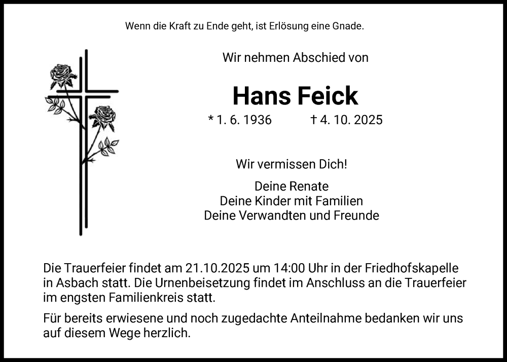 Hier finden Sie alle Traueranzeigen aus der Zeitung, die bisher für Hans Feick erschienen sind. Weitere Traueranzeigen, die in der Zeitung erscheinen, werden hier ebenfalls aufgelistet