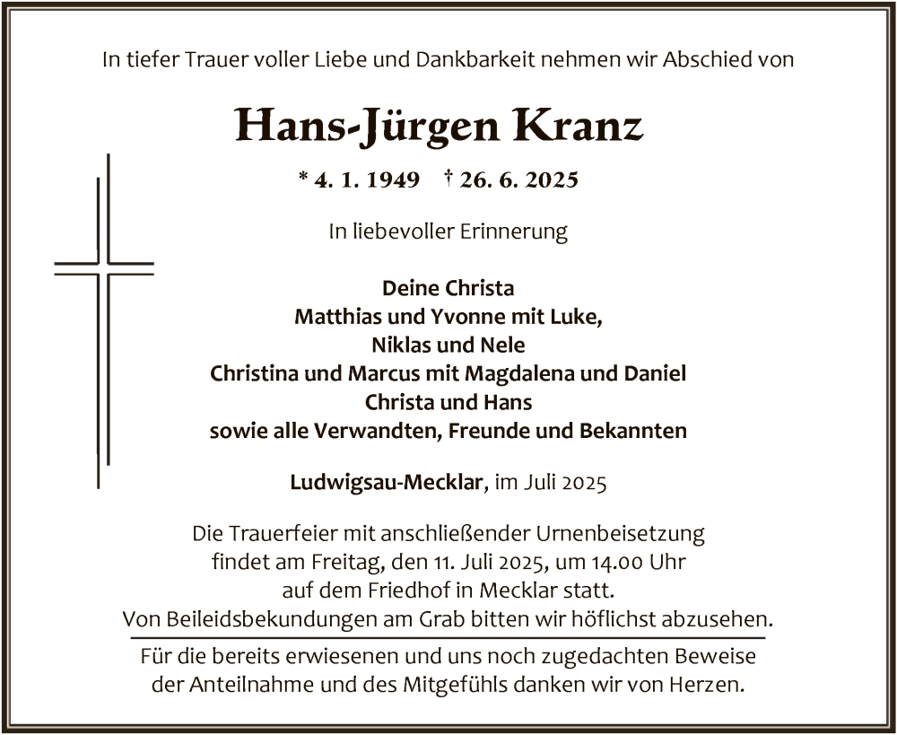 Hier finden Sie alle Traueranzeigen aus der Zeitung, die bisher für Hans-Jürgen Kranz erschienen sind. Weitere Traueranzeigen, die in der Zeitung erscheinen, werden hier ebenfalls aufgelistet