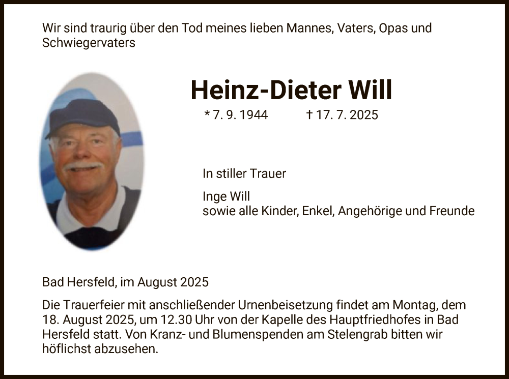 Hier finden Sie alle Traueranzeigen aus der Zeitung, die bisher für Heinz-Dieter Will erschienen sind. Weitere Traueranzeigen, die in der Zeitung erscheinen, werden hier ebenfalls aufgelistet