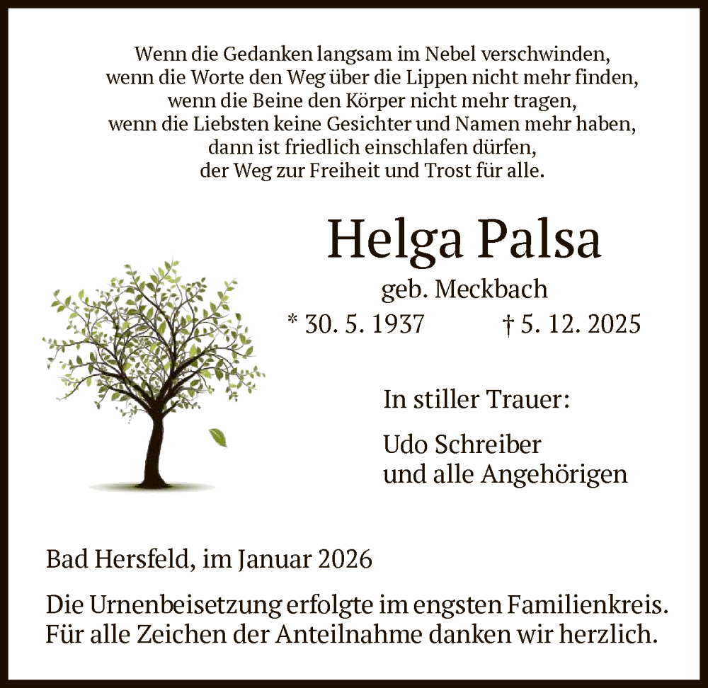 Hier finden Sie alle Traueranzeigen aus der Zeitung, die bisher für Helga Palsa erschienen sind. Weitere Traueranzeigen, die in der Zeitung erscheinen, werden hier ebenfalls aufgelistet
