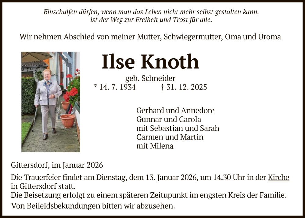 Hier finden Sie alle Traueranzeigen aus der Zeitung, die bisher für Ilse Knoth erschienen sind. Weitere Traueranzeigen, die in der Zeitung erscheinen, werden hier ebenfalls aufgelistet