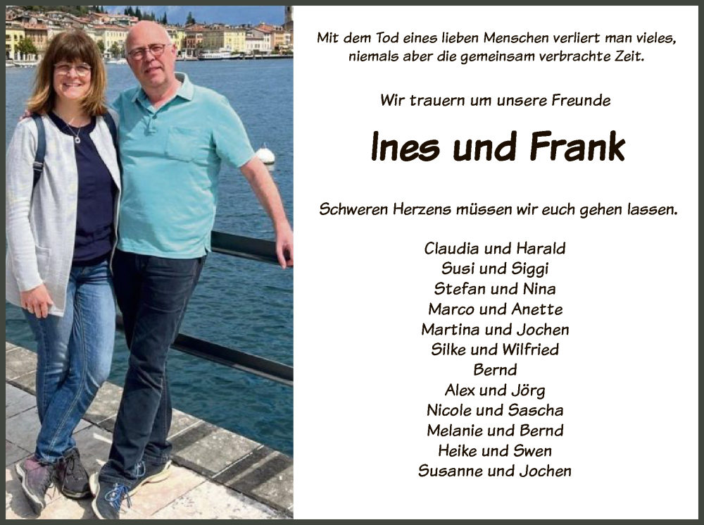 Hier finden Sie alle Traueranzeigen aus der Zeitung, die bisher für Ines und Frank erschienen sind. Weitere Traueranzeigen, die in der Zeitung erscheinen, werden hier ebenfalls aufgelistet