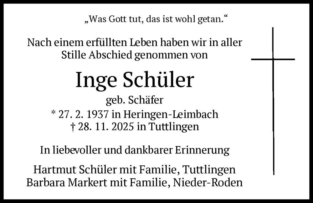 Hier finden Sie alle Traueranzeigen aus der Zeitung, die bisher für Inge Schüler erschienen sind. Weitere Traueranzeigen, die in der Zeitung erscheinen, werden hier ebenfalls aufgelistet