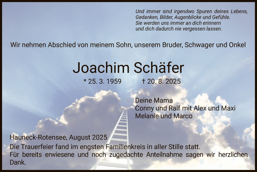 Hier finden Sie alle Traueranzeigen aus der Zeitung, die bisher für Joachim Schäfer erschienen sind. Weitere Traueranzeigen, die in der Zeitung erscheinen, werden hier ebenfalls aufgelistet