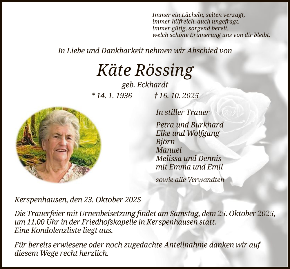 Hier finden Sie alle Traueranzeigen aus der Zeitung, die bisher für Käte Rössing erschienen sind. Weitere Traueranzeigen, die in der Zeitung erscheinen, werden hier ebenfalls aufgelistet