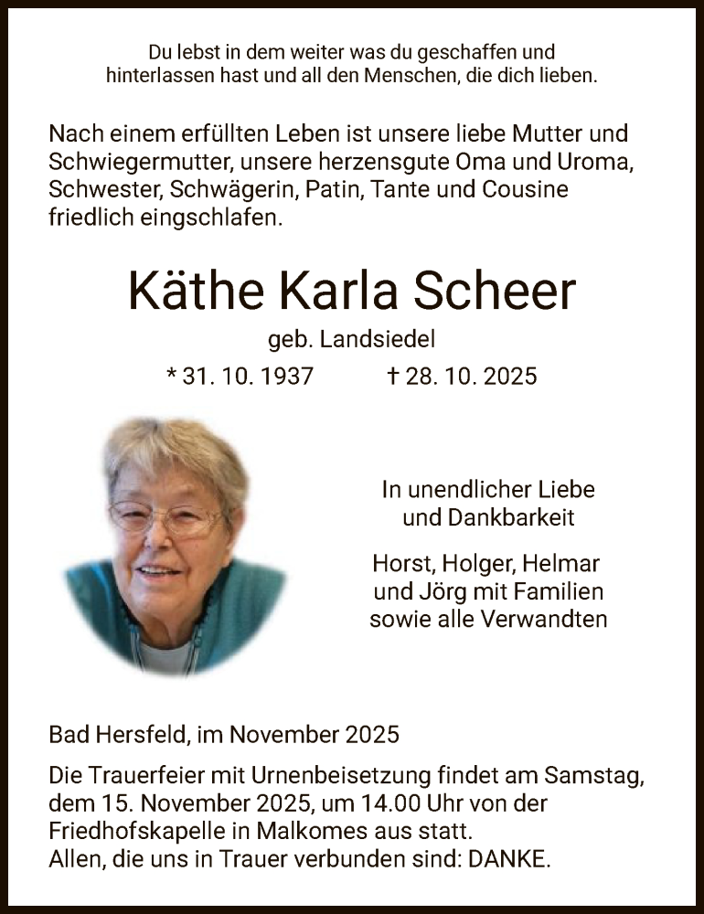 Hier finden Sie alle Traueranzeigen aus der Zeitung, die bisher für Käthe Karla Scheer erschienen sind. Weitere Traueranzeigen, die in der Zeitung erscheinen, werden hier ebenfalls aufgelistet