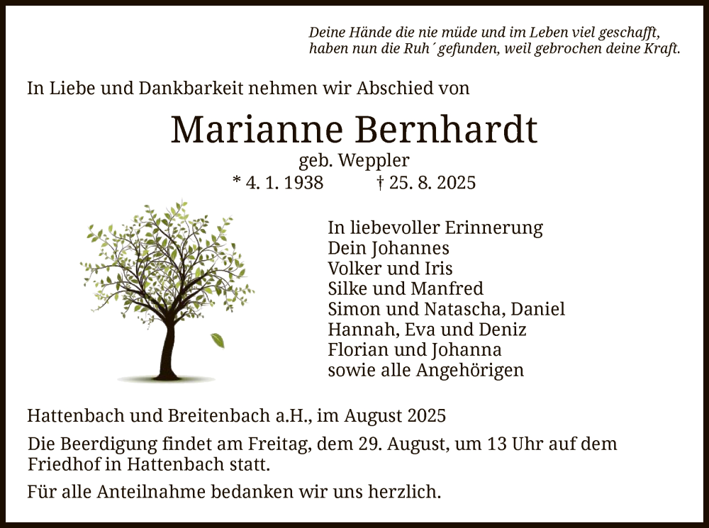 Hier finden Sie alle Traueranzeigen aus der Zeitung, die bisher für Marianne Bernhardt erschienen sind. Weitere Traueranzeigen, die in der Zeitung erscheinen, werden hier ebenfalls aufgelistet