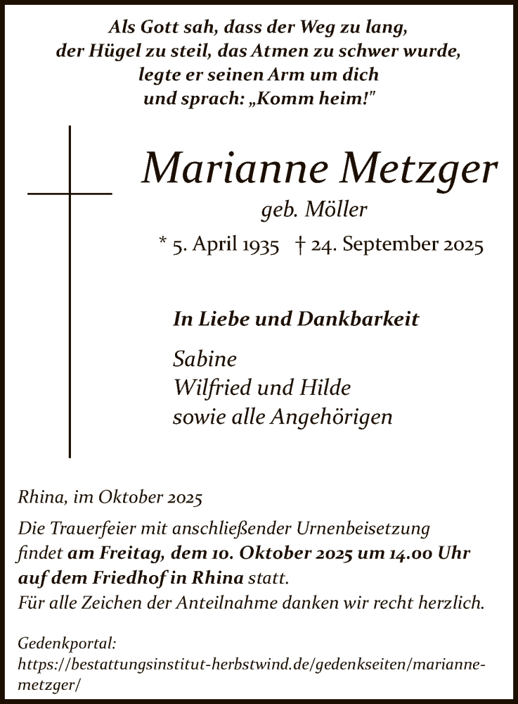 Hier finden Sie alle Traueranzeigen aus der Zeitung, die bisher für Marianne Metzger erschienen sind. Weitere Traueranzeigen, die in der Zeitung erscheinen, werden hier ebenfalls aufgelistet