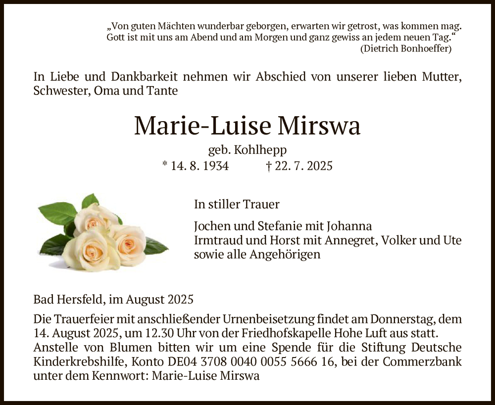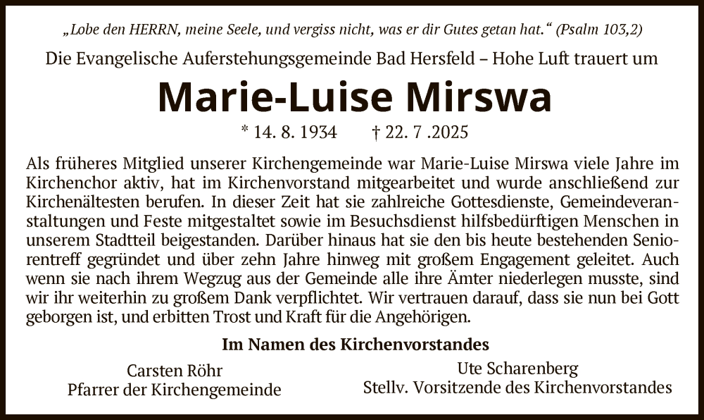 Hier finden Sie alle Traueranzeigen aus der Zeitung, die bisher für Marie-Luise Mirswa erschienen sind. Weitere Traueranzeigen, die in der Zeitung erscheinen, werden hier ebenfalls aufgelistet
