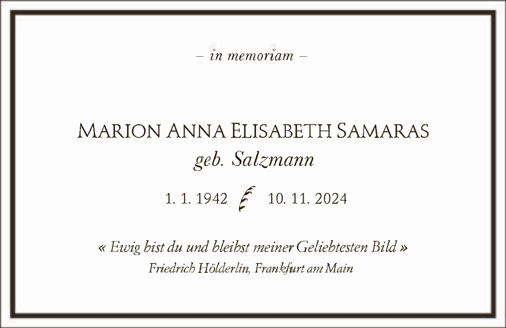 Hier finden Sie alle Traueranzeigen aus der Zeitung, die bisher für Marion Anna Elisabeth Samaras erschienen sind. Weitere Traueranzeigen, die in der Zeitung erscheinen, werden hier ebenfalls aufgelistet