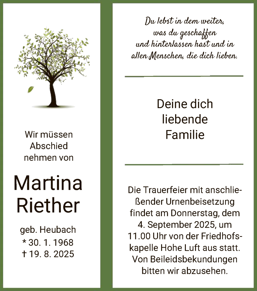 Hier finden Sie alle Traueranzeigen aus der Zeitung, die bisher für Martina Riether erschienen sind. Weitere Traueranzeigen, die in der Zeitung erscheinen, werden hier ebenfalls aufgelistet