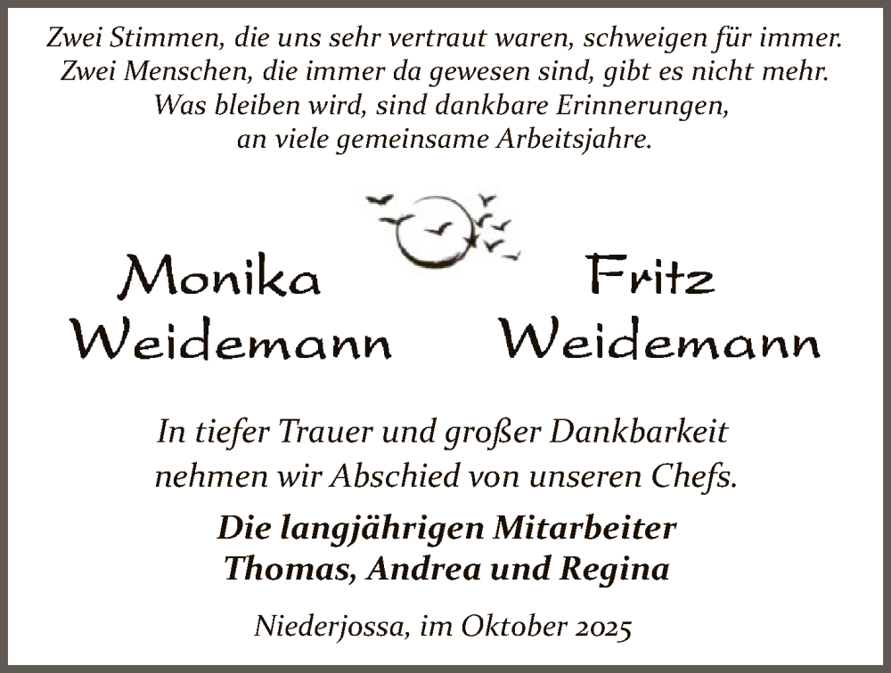 Hier finden Sie alle Traueranzeigen aus der Zeitung, die bisher für Monika und Fritz Weidemann erschienen sind. Weitere Traueranzeigen, die in der Zeitung erscheinen, werden hier ebenfalls aufgelistet