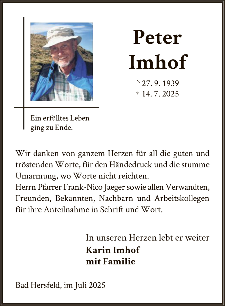 Hier finden Sie alle Traueranzeigen aus der Zeitung, die bisher für Peter Imhof erschienen sind. Weitere Traueranzeigen, die in der Zeitung erscheinen, werden hier ebenfalls aufgelistet