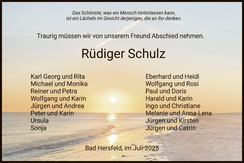 Hier finden Sie alle Traueranzeigen aus der Zeitung, die bisher für Rüdiger Schulz erschienen sind. Weitere Traueranzeigen, die in der Zeitung erscheinen, werden hier ebenfalls aufgelistet