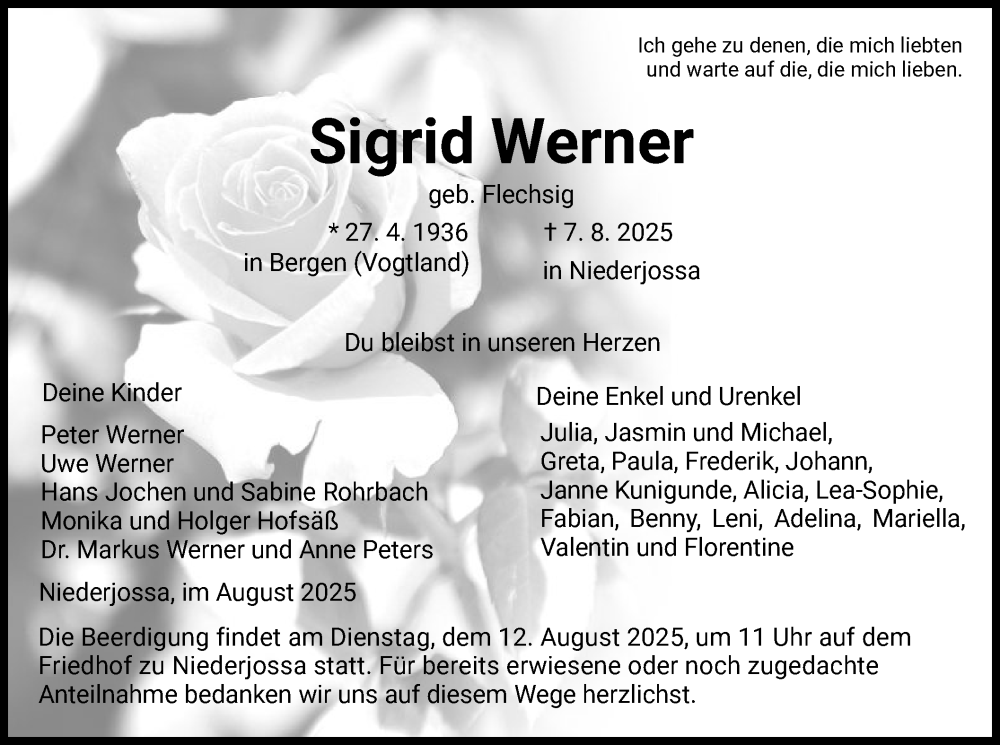 Hier finden Sie alle Traueranzeigen aus der Zeitung, die bisher für Sigrid Werner erschienen sind. Weitere Traueranzeigen, die in der Zeitung erscheinen, werden hier ebenfalls aufgelistet