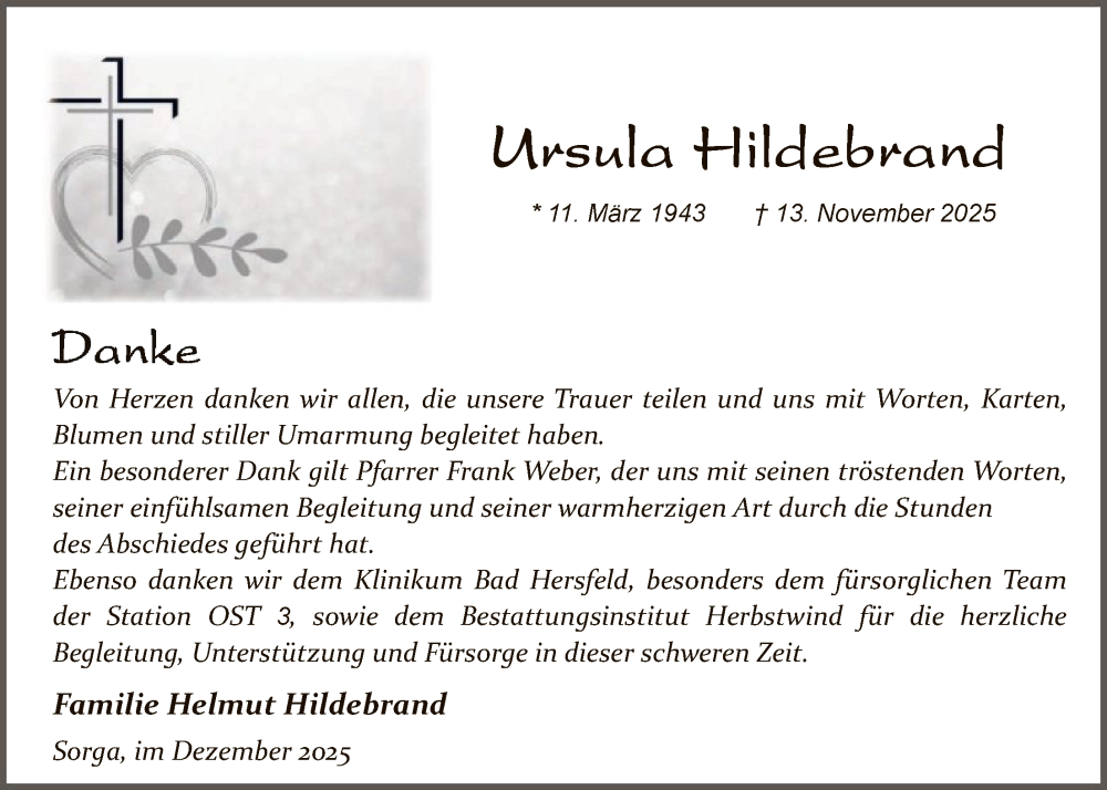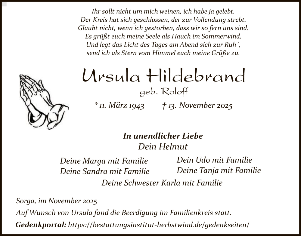 Hier finden Sie alle Traueranzeigen aus der Zeitung, die bisher für Ursula Hildebrand erschienen sind. Weitere Traueranzeigen, die in der Zeitung erscheinen, werden hier ebenfalls aufgelistet