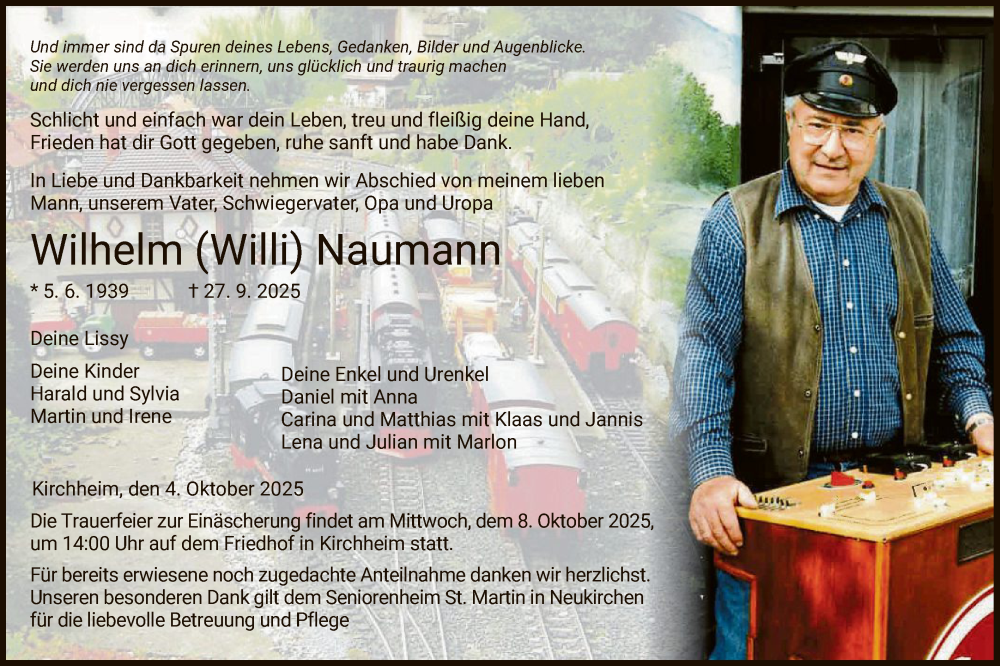 Hier finden Sie alle Traueranzeigen aus der Zeitung, die bisher für Wilhelm Naumann erschienen sind. Weitere Traueranzeigen, die in der Zeitung erscheinen, werden hier ebenfalls aufgelistet